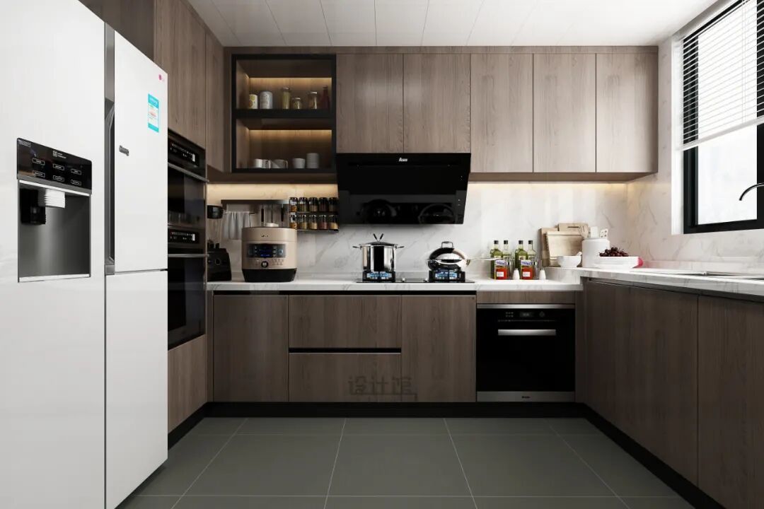作念吊柜的本事,把油烟机上半部分包起来,这么看起来猖狂好意思不雅,何况也能把油烟机上方的空间诳骗上,不错收纳些小物件。